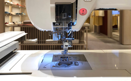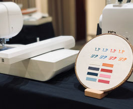Embroidery of initials onto keepsake pouches made from the brand's signature cashmere; machine precision for a personal touch.